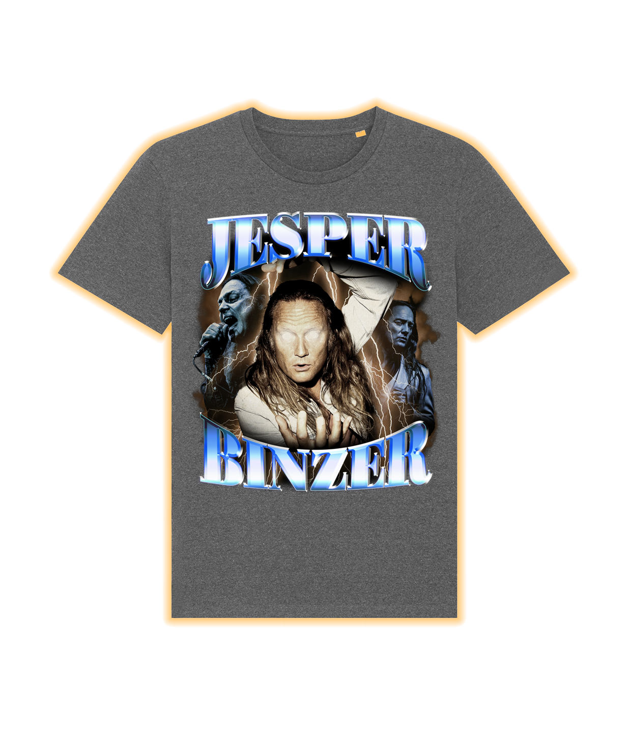 Grå T-shirt med stor tekst i blå og en collage af jesper på fronten