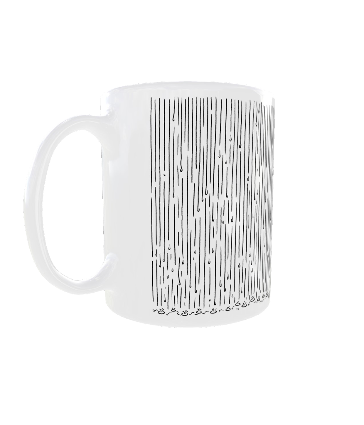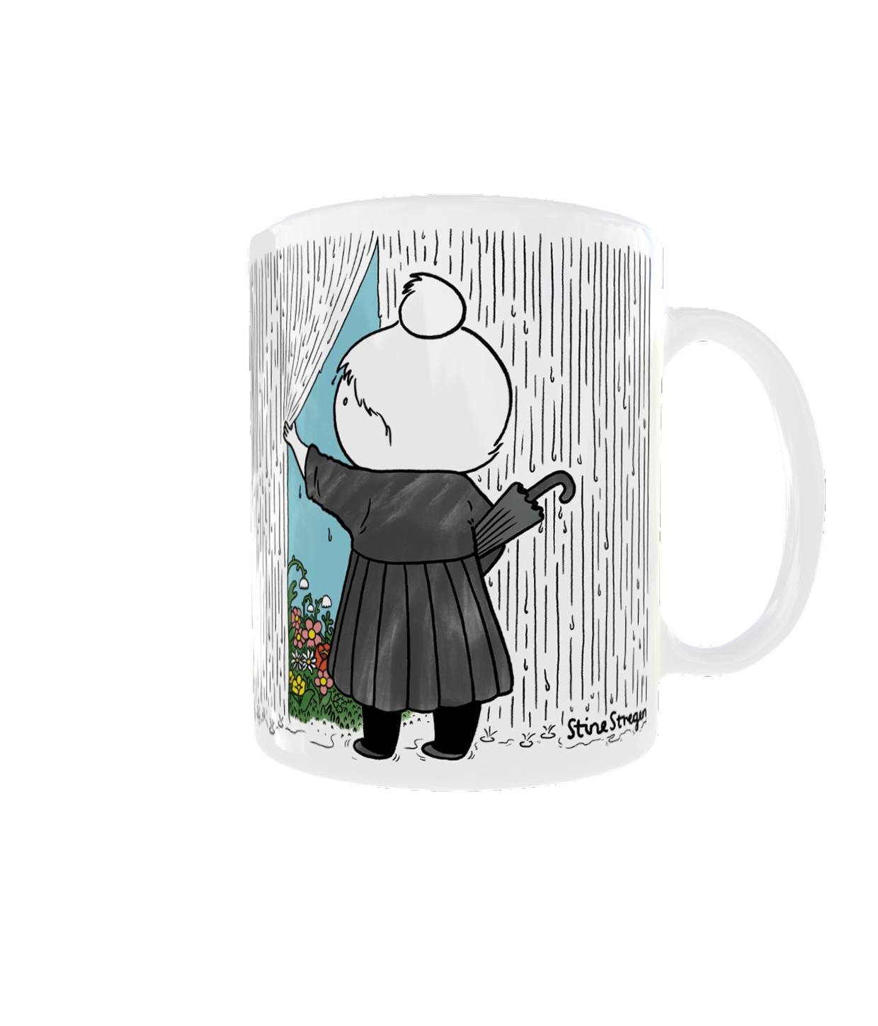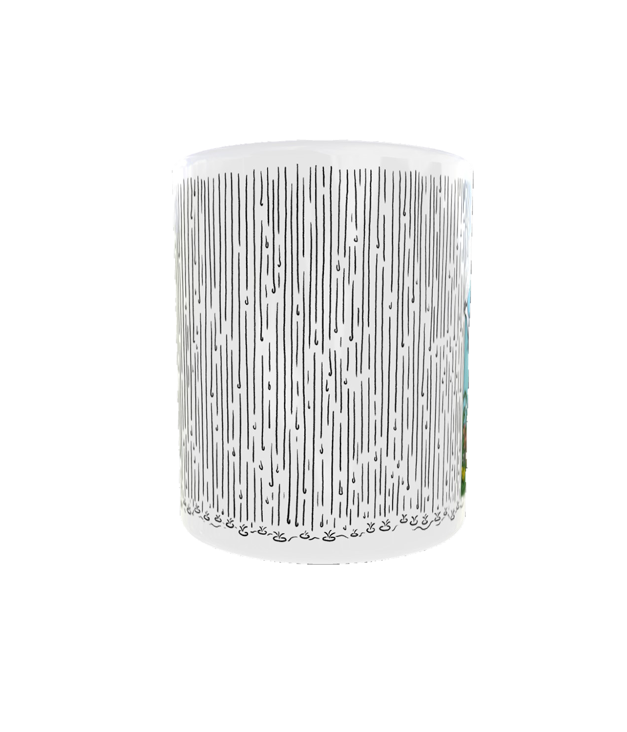 Hvidt krus med tegningen Forår på det hvide krus.