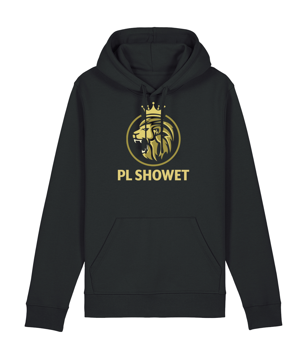 Sort hættetrøje med løve -og tekstlogo på forsiden.