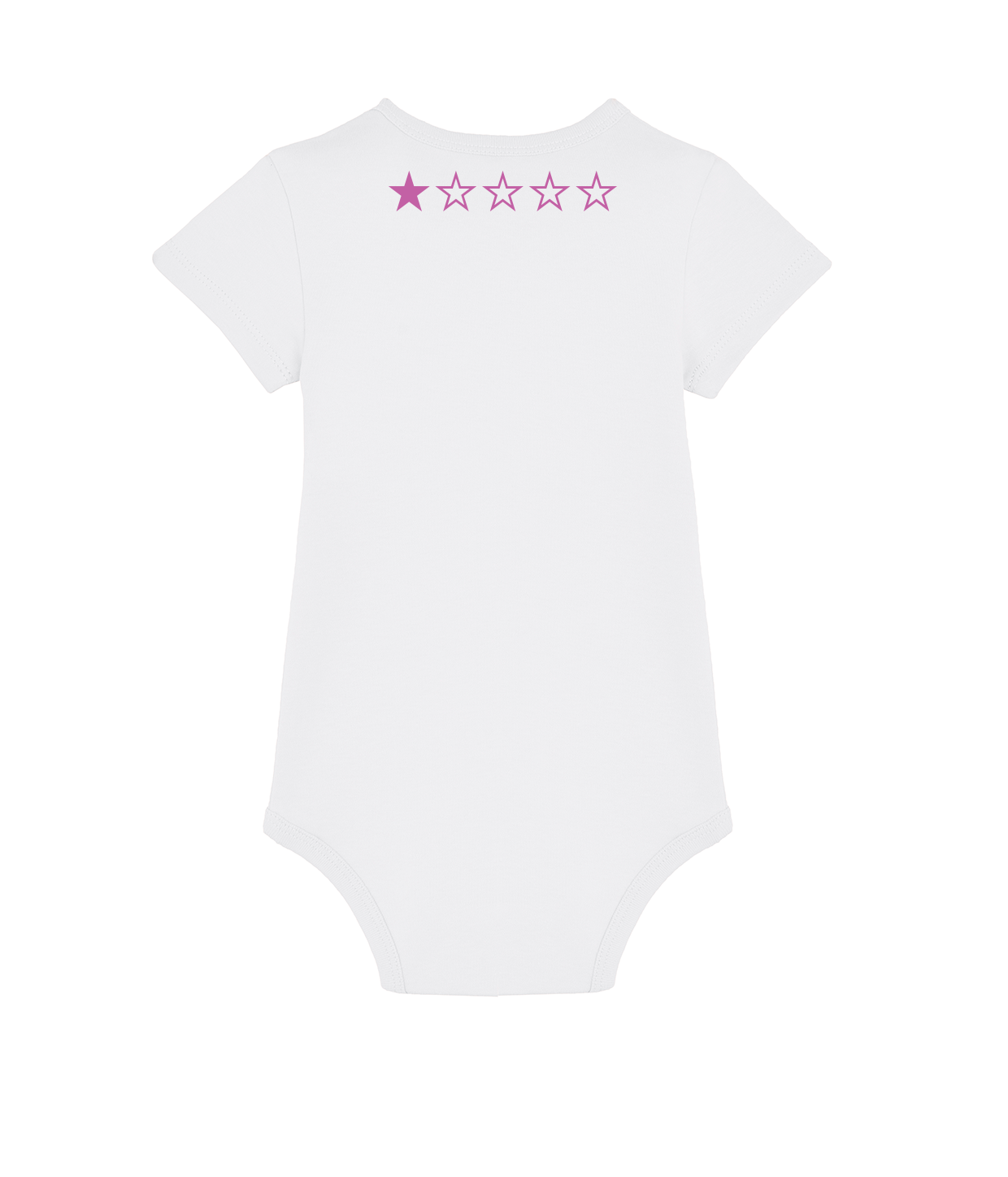 Hvid babybody med Slay -og tekstlogo på forsiden og Dommerne stjerner i nakken udvendigt.