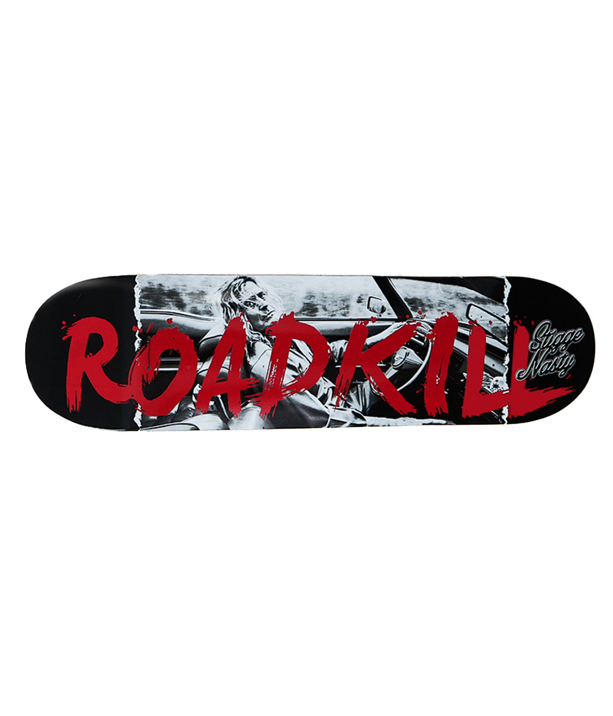 Et skateboard bræt med Stiggenasty bag rattet med stor rød tekst skrevet henover "ROADKILL".